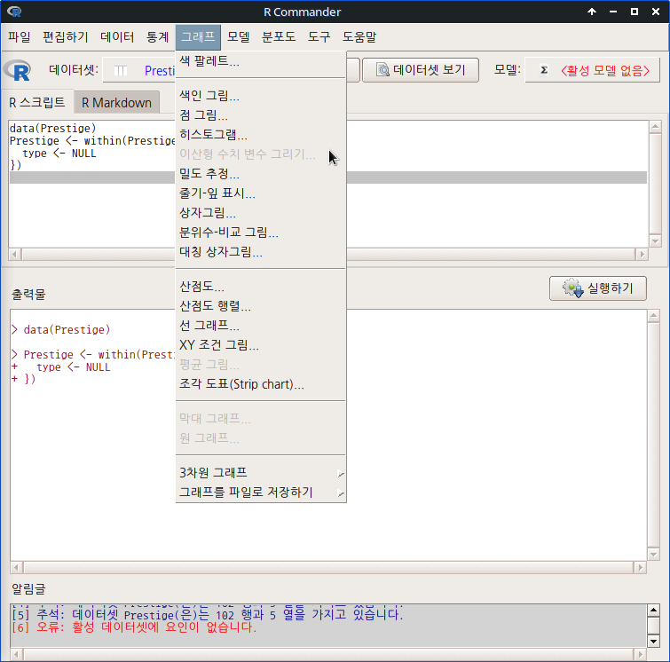 어느 데이터셋이 활성화되면, 포함된 변수군의 특징에 따라 그래프 메뉴창에서 사용할 수 있는 기능들이 활성화된다. 어느 그래프 기능을 사용할 것인가라는 문제의식은 변수들의 특징에 대한 이해에서 출발해야 한다.
