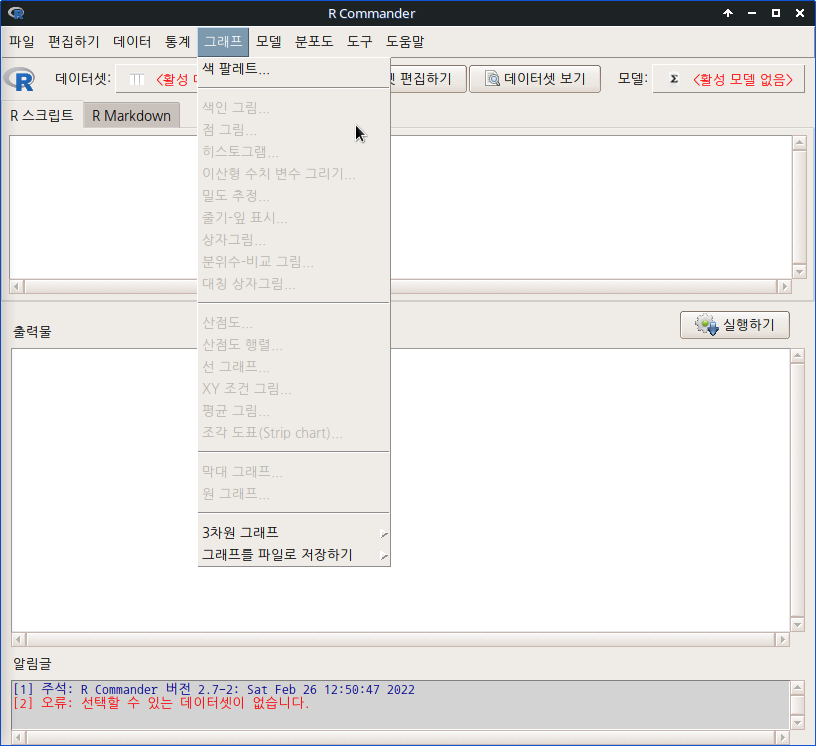 활성화된 데이터셋이 없는 경우, 그래프 메뉴창의 대부분 기능은 비활성화되어 있다.