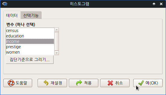 히스토그램으로 시각화할 변수는 수치형 (numeric, integer)이다. Prestige의 요인형 변수 type은 <집단기준으로 그리기...>에서 선택할 수 있다.