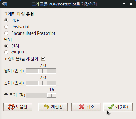 그래프 > 그래프를 파일로 저장하기 > PDF/Postscript/EPS(으)로 에서 PDF 파일로 저장해보자. 넓이와 높이에 대한 조정 없이<글 크기 (점)>을 16까지 키워보자.