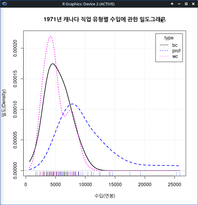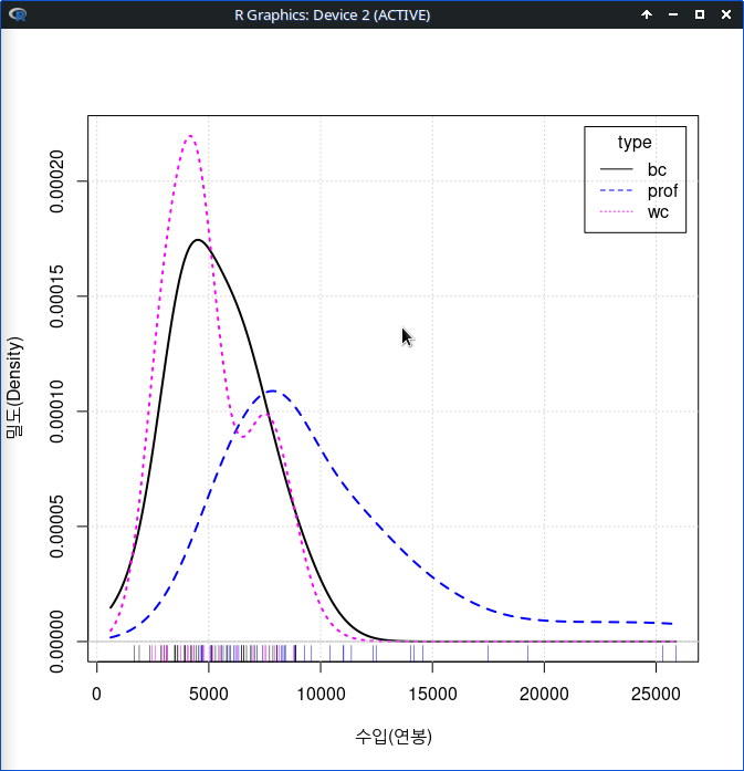 그래픽장치 창에 type 별 수입(연봉)에 대한 밀도 그래프가 등장한다. 그래프의 오른쪽에는 네모상자 안에 범례 표시가 있어서 어떤 선이 요인형 변수의 어떤 수준을 나타내는지 알려준다.