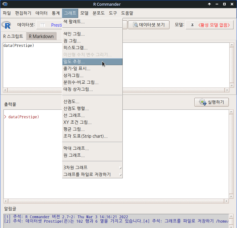 아래 코드에서 'main'인자를 살펴보라. 메뉴창에 등장하는 기능을 활용하면서 적용할 수 있는 범위에 DensityPlot 함수에는 제목 입력이 없다. 아쉽기도 한 부분이다. 이 경우는 입력창에서 main="제목 이름"을 추가하여 넣고 실행하기 버튼을 누르면 된다.