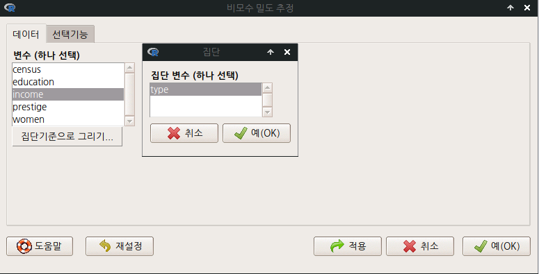 한편, 직업유형인 요인형 변수 type을 기준으로 수입(연봉)의 분포를 재분류해보자. <집단 기준으로 그리고...> 버튼을 누르면 <집단 변수 (하나 선택)> 기능에서 요인형 변수 목록이 나타날 것이다. Prestige 데이터셋에는 type 하나만 있다. 그리고 예(OK) 버튼을 누른다.