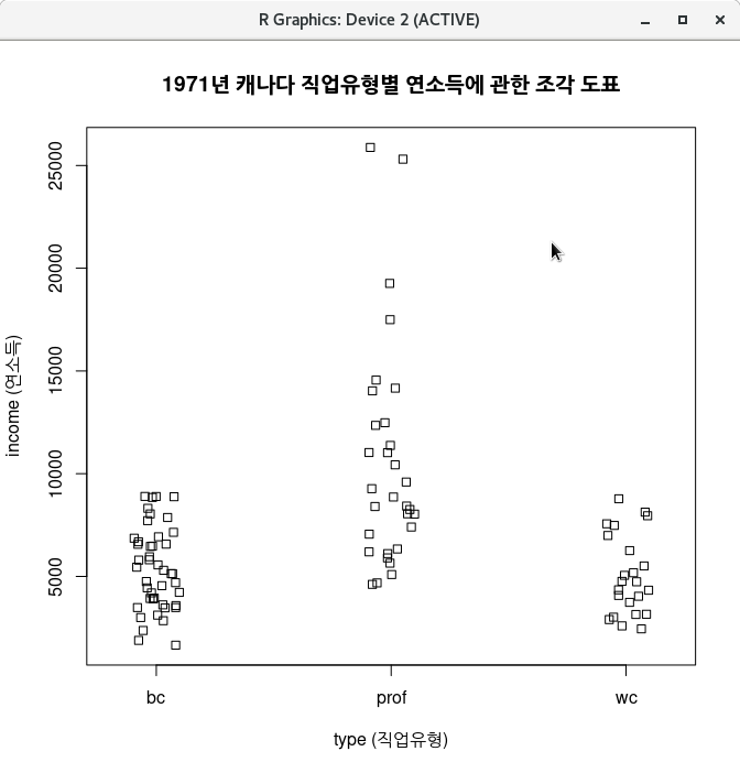 아래 그래픽장치 창에 '조각 도표(Strip chart)'가 제작된다. 직업유형별로 연소득의 사례들이 크기별로 표시되어 있음을 알 수 있다.