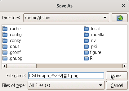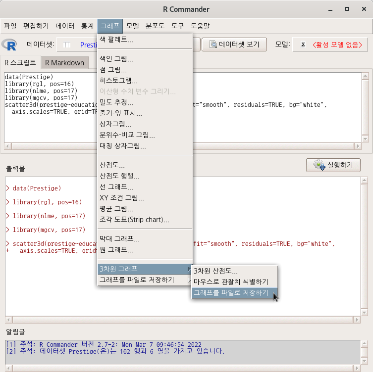 carData 패키지에서 제공하는 Prestige 데이터셋을 활용하여 만든 3차원 산점도이다. 위와 같이 3차원 그래프를 만들었다면, <그래프를 파일로 저장하기> 기능이 활성화될 것이다. 이 기능을 선택하면, 아래와 같이 저장경로와 추천하는 파일이름과 형식이 제공된다.