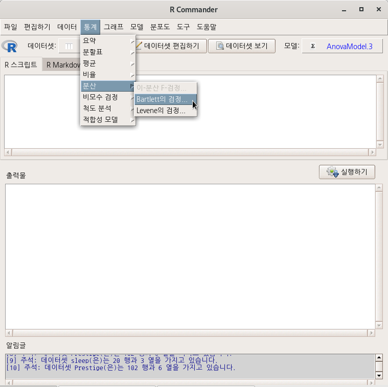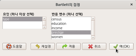 통계 > 분산 > Bartlett의 검정...
