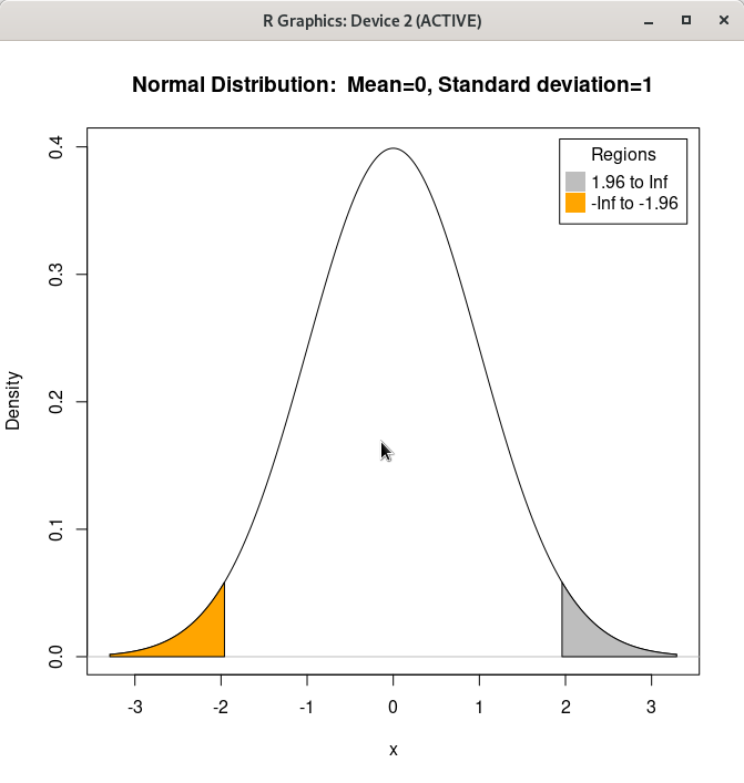 main=paste("Normal Distribution: Mean=0, Standard deviation=1"), regions=list(c(1.96, Inf), c(-Inf,