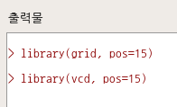 vcd 패키지를 적재(loading) 하는데, grid 패키지가 함께 탑재된 것을 출력창에서 확인할 수 있다. grid는 vcd 패키지가 제작되는데 의존한 패키지임을 의미한다. 어느 패키지가 메모리에 적재되는 과정은 그 패키지가 의존하는 패키지의 자동적인 적재를 동반한다.