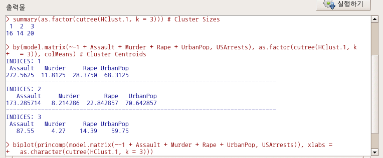 <위계적 군집 요약> 창에서 <군집의 수>를 3으로 변경해보자. <군집 요약 인쇄하기>, <군집 행렬도(Bi-plot)> 등이 선택되어 있는 것을 점검하자.