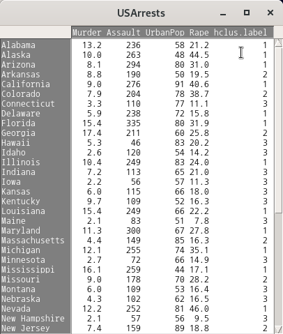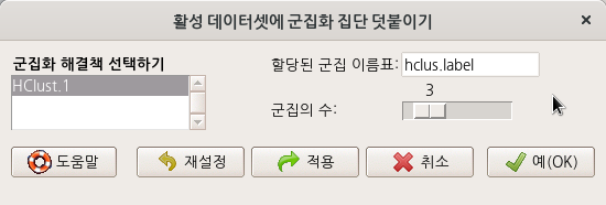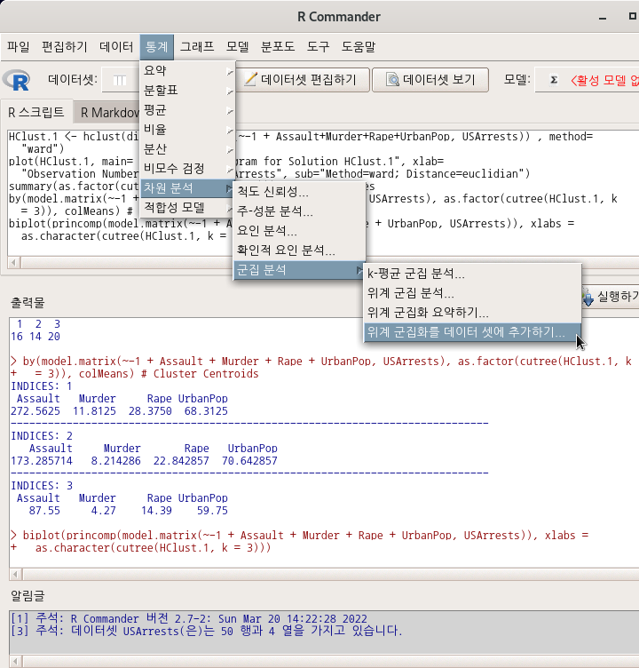 ' 통계 > 차원 분석 > 군집 분석 > 위계 군집 분석...' 기능을 진행했다고 하자. 그 다음에 <위계군집화를 데이터 셋에 추가하기...>를 이용할 수 있다. <군집의 수:>를 3으로 변경하자. 그리고 예(OK) 버튼을 누르면, hclus.label라는 변수가 USArrests 데이터셋에 추가된다.
