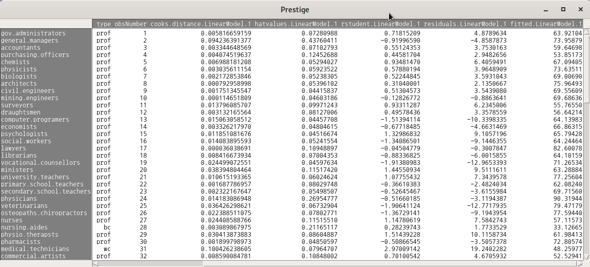데이터셋을 활성화시킨 다음, 그 데이터셋으로 모델을 만들었다고 생각하자. 예를 들어, carData 패키지의 Prestige 데이터셋으로 선형 모델을 만들었고, 그 모델을 LinearModel.1이라고 하자.