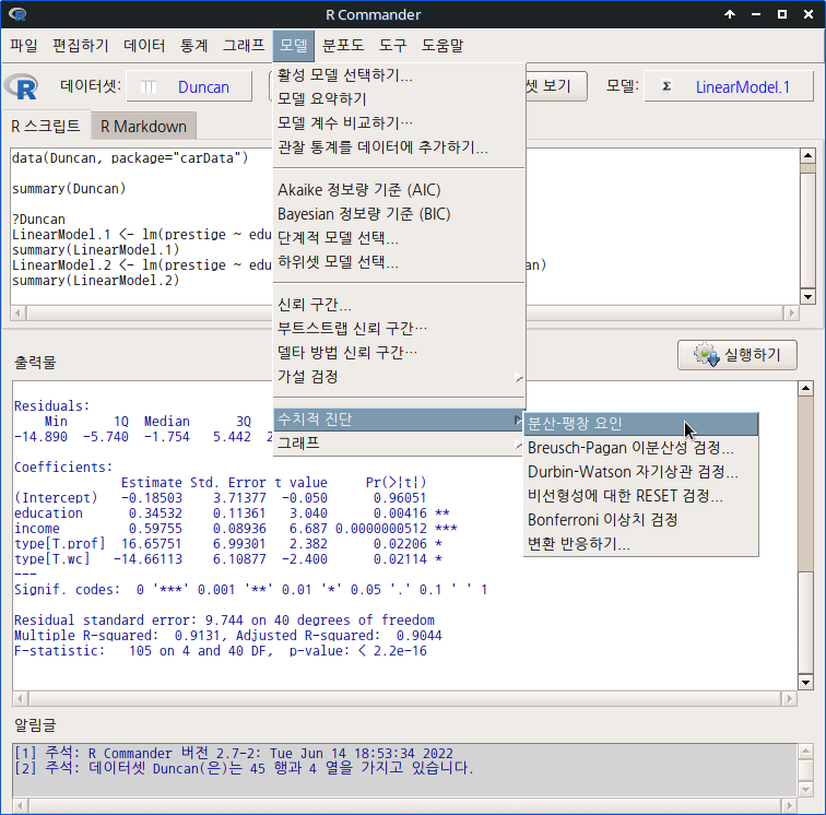 data(Duncan, package="carData") R Commander의 상단에 있는 '데이터셋 보기' 버튼을 누르면, 아래와 같이 데이터셋 내부를 볼 수 있다. ?Duncan # Duncan 데이터셋 도움말 보기 Duncan {carData} R Documentat..