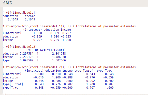 LinearModel.1과 LinearModel.2의 vif() 결과는 아래와 같다. LinearModel.1과 LinearModel.2의 vif() 결과가 다른 형식을 취한 이유는 LinearModel.2에 type이라는 요인형 변수가 있기 때문이다.