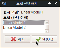 '통계 > 적합성 모델 > 선형 모델...' 기능을 통하여 LinearModel.1과 LinearModel.2를 만든다.