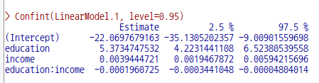 LinearModel.1의 계수(Coefficients) 정보에는 투입된 설명변수들의 영향력에 대한 추정치(Estimate)가 있다. '모델 > 신뢰 구간...'은 확률에 따른 추정치를 계산한다.