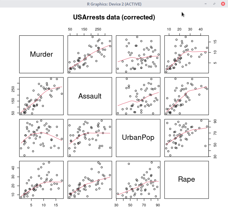 pairs(UA.C, panel = panel.smooth, main = "USArrests data (corrected)")