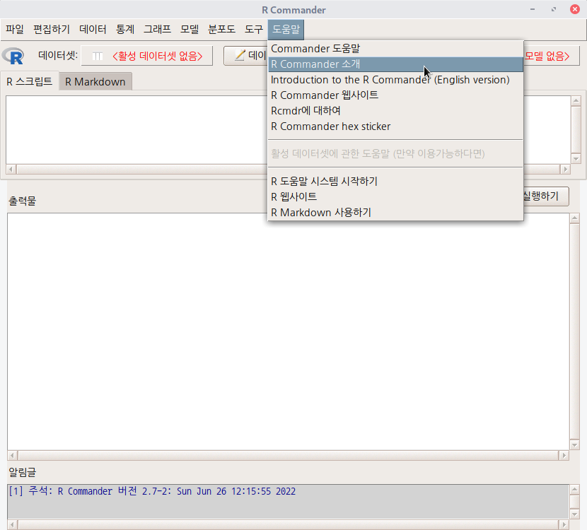 '도움말 > R Commander 소개'/ 'Help > Introduction to the R Commander' 메뉴 버튼을 누르면 Rcmdr에 내장된 Getting-Started-with-the-Rcmdr-ko.pdf 또는 Getting-Started-with-the-Rcmdr.pdf 파일이 등장한다. 영어 문서는 개발자 John Fox 교수님이 관리하는 것으로, 비록 기초 소개문서임에도 업그레이드시 문서에 잘 반영되고 있다.