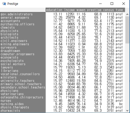 메모리로 불러온 데이터의 내부 값들을 볼 때 사용한다. 데이터프레임화 된 객체 전체를 보거나, 일부 변수들만 추려서 볼 수도 있다. carData 패키지에 포함된 Prestige 데이터셋을 사용하여 연습해보자. '데이터 > 패키지에 있는 데이터 > 첨부된 패키지에서 데이터셋 읽기...' 기능을 선택하여 Prestige 데이터셋을 선택하자. 그러면, R Commander 상단의 '활성 데이터셋 없음'이 'Prestige'로 바뀐다. 이후 '활성데이터셋 > 데이터 보기...'를 선택하면 아래와 같은 메뉴창이 등장한다.