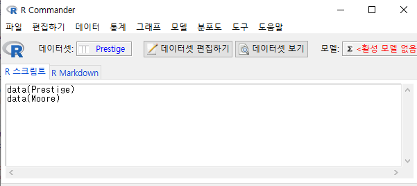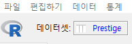 R Commander 화면에서 R 아이콘 옆에 '데이터셋: Prestige' 이 뜬다.