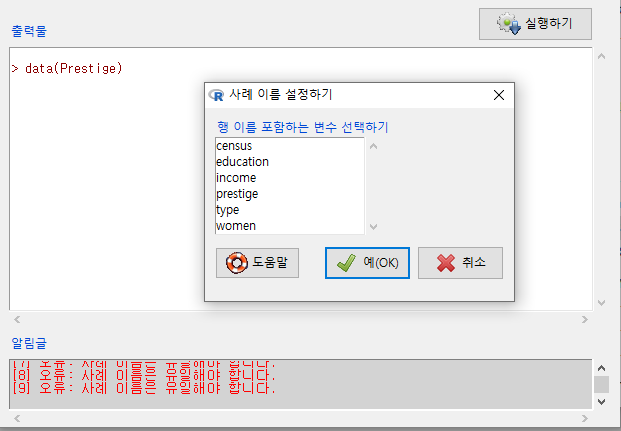 그런데, 이 기능을 사용하기 위해서는 R의 특징을 알아야 한다. 첫째, 사례 이름은 유일해야 한다. 동일한 행의 이름을 넣을 수 없다는 것이다. 이 원칙은 행의 이름으로 사용하기 위해서 변수들에서 하나를 선택해야하는 이 기능 <사례 이름 정하기>에서 많은 변수들이 이 원칙을 위배하기 때문에 오류문을 생산하는 경우가 흔하다. 행이름은 흔히 key 값이라 부르는 고유성을 가져야 하는데, 이 고유성이 어느 변수의 사례값에서 발견되기는 쉽지 않다.