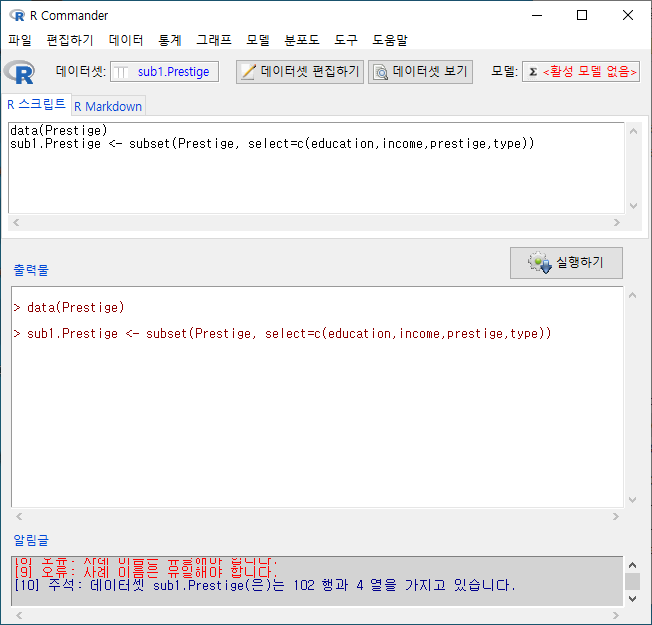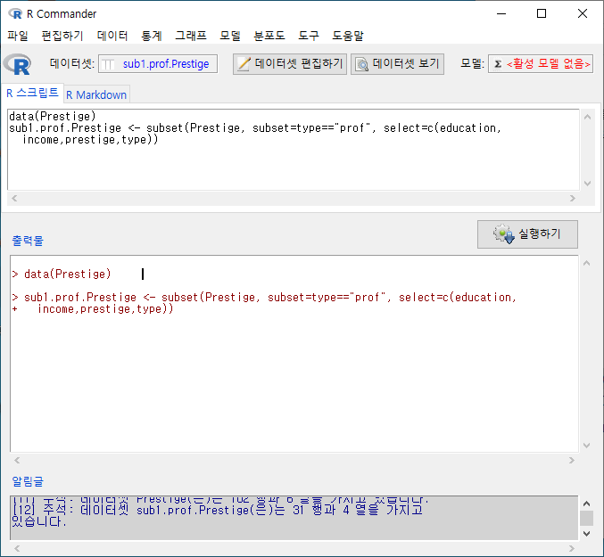 다음 화면의 입력창, 출력창, 알림글을 살펴보라. 활성 데이터셋의 이름이 sub1.prof.Prestige라고 바뀌었고, subset()의 인자가 추가되었으며, sub1.prof.Prestige 데이터셋의 행과 열 정보를 찾을 수 있다: