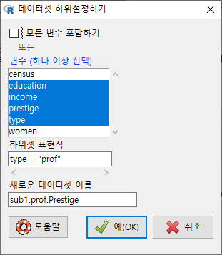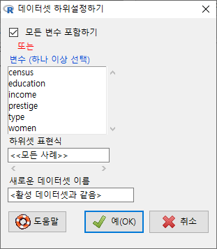 변수집단을 선택할 경우는 <모든 변수 사용하기>에 기본지정된 옵션을 해제해야 한다. 물론 변수일부를 선택하는 것과 별개로 사례값(행) 일부를 선택할 수도 있다. 이 경우는 사용자가 직접 <하위셋 표현식>에 스크립트를 입력해야 한다. 초보자는 당황할 수 있다.