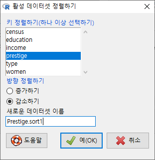 직종의 권위에 대한 인식의 높낮이를 기준으로 자료를 정렬해보자. prestige 변수를 선택하고, <방향 정렬하기>에서 감소하기를 선택하고, <새로운 데이터셋 이름>에서 Prestige.sort1 이라고 입력한다.
