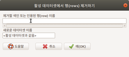 활성 데이터셋에서 행을 제거하는 기능이다. 대화창이 열리면 사용자는 제거할 행의 정보를 알고 있는 상황에서 제거를 위한 행을 지정해야 한다. 색인 또는 행의 이름, 행의 일련번호 등을 알고 있어야 한다. 초보자에게는 쉽지 않은 기능이다.