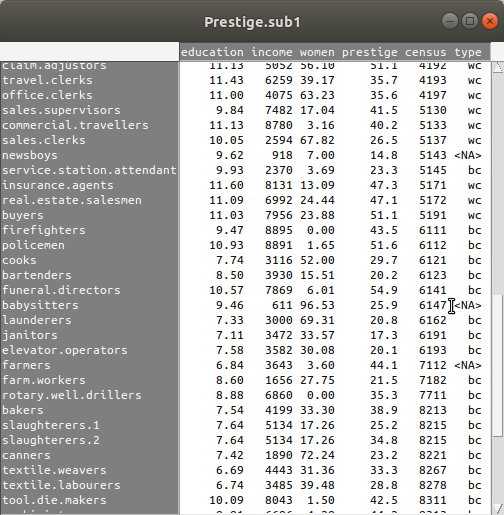 한편, Prestige 데이터셋의 type 변수에 값이 입력되지 않은 것이 있다. newsboys, babysitters, farmers 라는 사례명을 가진 행의 type 변수 칸에는 <NA> 으로 되어있다.