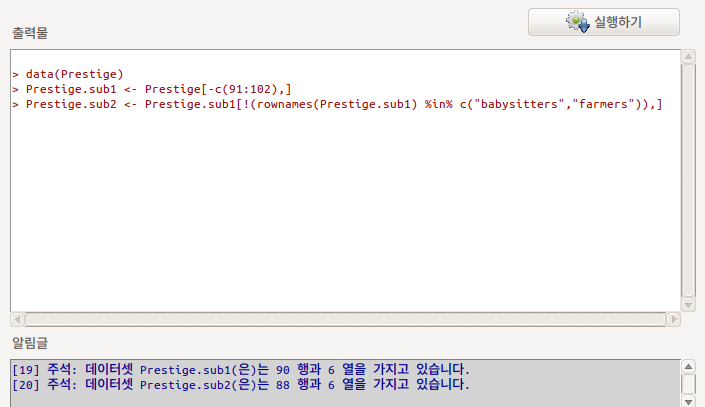 Prestige.sub1 데이터셋에서 babysitters, farmers 두개의 사례를 제거했기 때문에, 알림글의 지시문을 보면 사례수는 90개에서 88개로 줄어들었음을 확인할 수 있다.