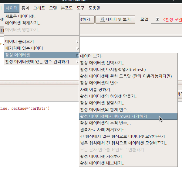 데이터 > 활성 데이터셋 > 활성 데이터셋에서 행(rows) 제거하기...