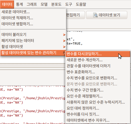 데이터 > 활성 데이터셋의 변수 관리하기 > 변수를 다시 코딩하기...