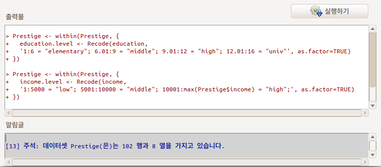 Prestige 데이터셋에 있는 수치형 변수 education의 구간을 만들어 사례값들을 넣고 요인형로 변수로 만들고자 한다. 아래와 같이 <'다시 코딩하기' 지시문 입력하기>에 입력할 수 있다. 1부터 6까지는 elementary로, 6.01에서 9까지는 middle로 , 9.01에서 12까지는 high로, 12.01에서 16까지 univ라는 구간명을 만들어 넣을 수 있다.