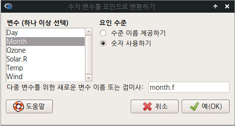 데이터 > 활성 데이터셋의 변수 관리하기 > 수치 변수를 요인으로 변환하기...