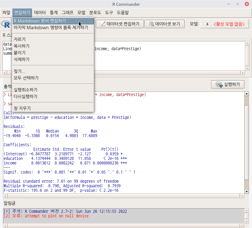 '편집 > R Markdown 문서 편집하기' 메뉴 기능을 선택하면 아래와 같은 편집기가 등장한다.