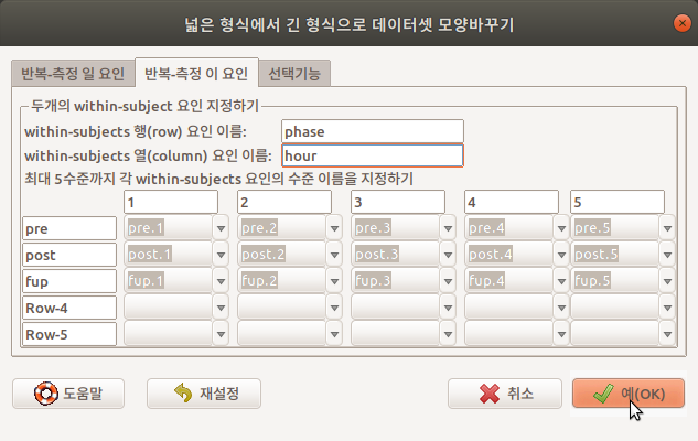 아래 메뉴창에서 <within-subjects 행(row) 요인 이름: >에 pre, post, fup을 포괄하는 phase를, <within-subjects 열(column) 요인 이름: >에 1, 2, 3, 4, 5를 포괄하는 hour를 넣자.
