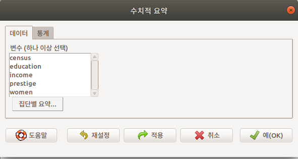 다시 데이터 창으로 와서 prestige 라는 변수의 수치적 요약 정보를 보고자 한다. prestige 변수를 선택하고, 오른쪽 아래의 예(OK) 버튼을 선택한다: