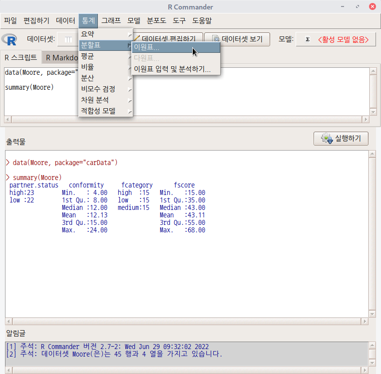 요인형 변수를 두개 이상 가지고 있는 데이터셋이 활성화되었다면, '통계 > 분할표 > 이원표...' 메뉴 기능을 이용할 수 있다.