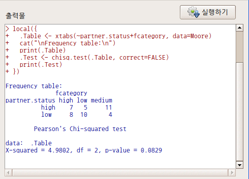 다음과 같은 출력물을 볼 수 있다. 행 변수에 partner.status, 열 변수에 fcategory를 선택한 경우의 출력물이다.
