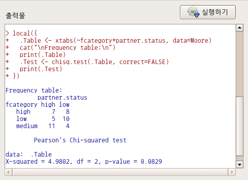 프롬프트의 입력 스크립트를 살펴보면, xtabs() 함수를 사용하는 것이 보인다.