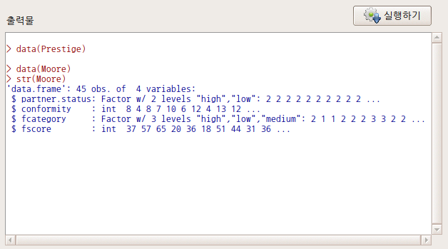 두개 이상의 요인형 변수를 가지고 있는 Moore 데이터셋을 활성화시키면, <이원표>의 음영이 사라지고 사용할 수 있는 기능이 된다.