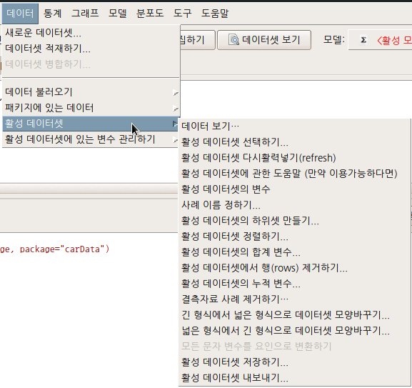 R Commander의 메뉴 기반 사용법의 큰 특징은 활성 데이터셋에 관한 것이 될 것이다. 입력 창에 명령문을 입력하는 일반적인 방법과 달리 메뉴 기반 R Commander는 활성화된 데이터셋 하나만을 다룬다. (물론 데이터셋 병합하기는 두개 이상의 데이터셋을 필요로 한다)