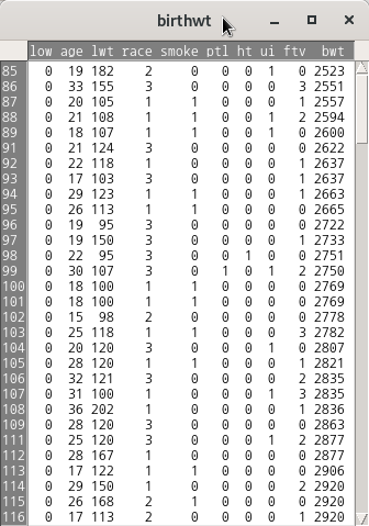 MASS > birthwt data(birthwt, package="MASS") birthwt 데이터셋이 활성화된 후, <데이터셋 보기> 버튼을 누르면 아래와 같이 내부 구성을 볼 수 있다: help("birthwt")