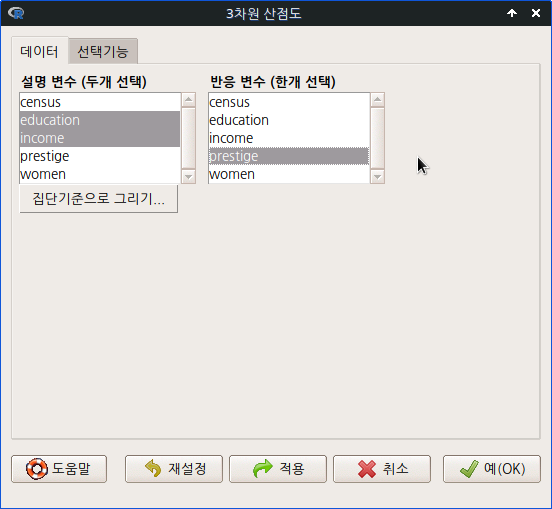 carData 패키지에 있는 Prestige 데이터셋을 활성화시키자. 교육연수와 연소득이 직업의 사회적 권위에 미치는 영향을 점검한다고 생각하자. <설명 변수 (두개 선택)>에 education, income을 <반응 변수 (한개 선택)>에 prestige 변수를 선택한다.