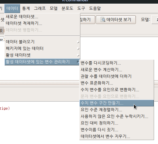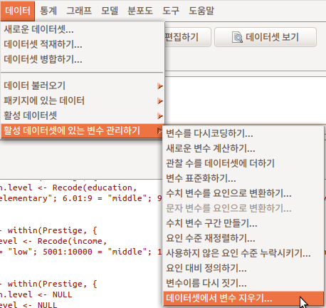 데이터셋 <- within(데이터셋, {삭제될변수 <- NULL })
