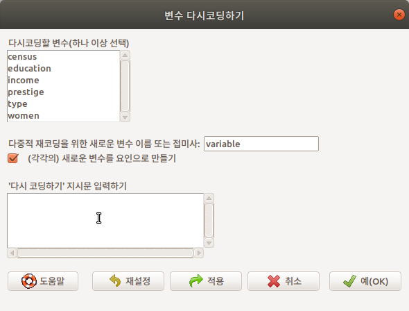 Prestige 데이터셋에 있는 수치형 변수 education의 구간을 만들어 사례값들을 넣고 요인형로 변수로 만들고자 한다. 아래와 같이 <'다시 코딩하기' 지시문 입력하기>에 입력할 수 있다. 1부터 6까지는 elementary로, 6.01에서 9까지는 middle로 , 9.01에서 12까지는 high로, 12.01에서 16까지 univ라는 구간명을 만들어 넣을 수 있다.