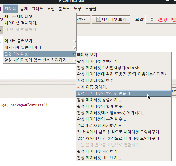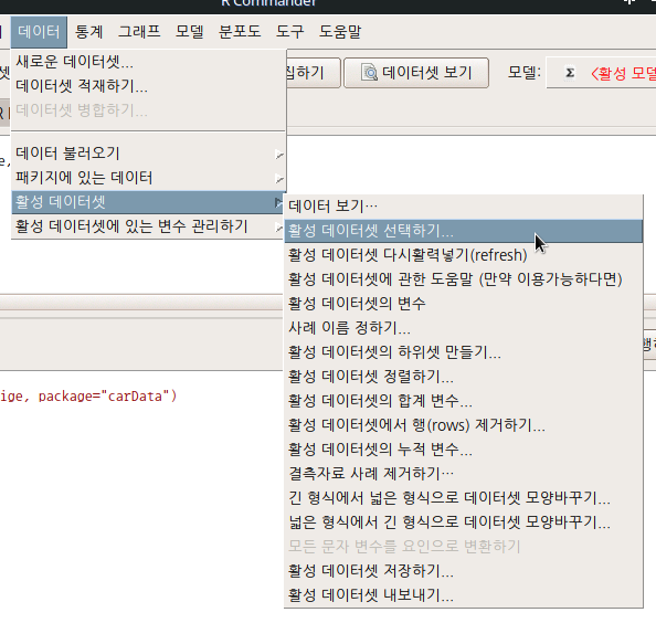 R Commander의 화면에서 활성 데이터셋이 Prestige.sort2로 바뀐다. 그리고 출력창에 새로운 함수 용례가 다음과 같이 등장할 것이다. 새로운데이터셋 <- with(활성데이터셋, 활성데이터셋[order(기준변수1이름, 기준변수2이름, decreasing=TRUE), ])