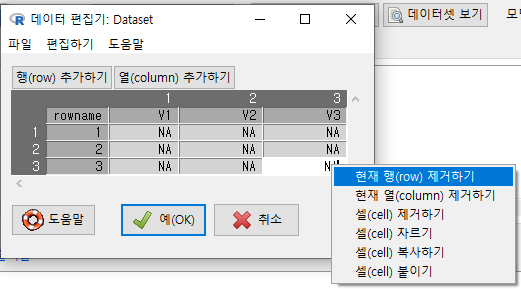 변수 3개(V1, V2, V3), 사례 3개(1, 2, 3) 등으로 열과 행을 추가할 수 있다.