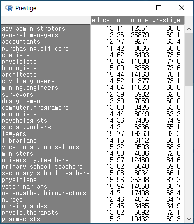 R Commander 화면에서 R 아이콘 옆에 '데이터셋: Prestige' 이 뜬다.