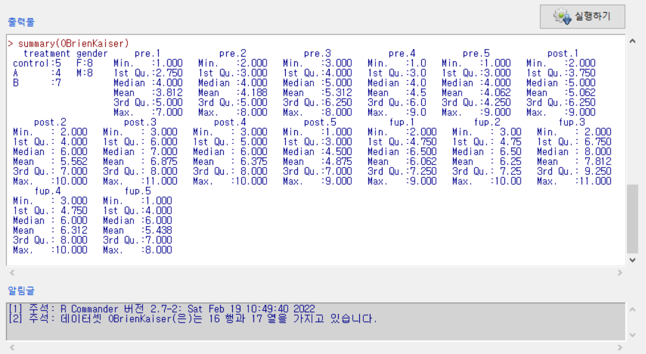 입력창에 summary(OBrienKaiser) 함수를 입력하고 실행하여 요약 정보를 살펴보자.